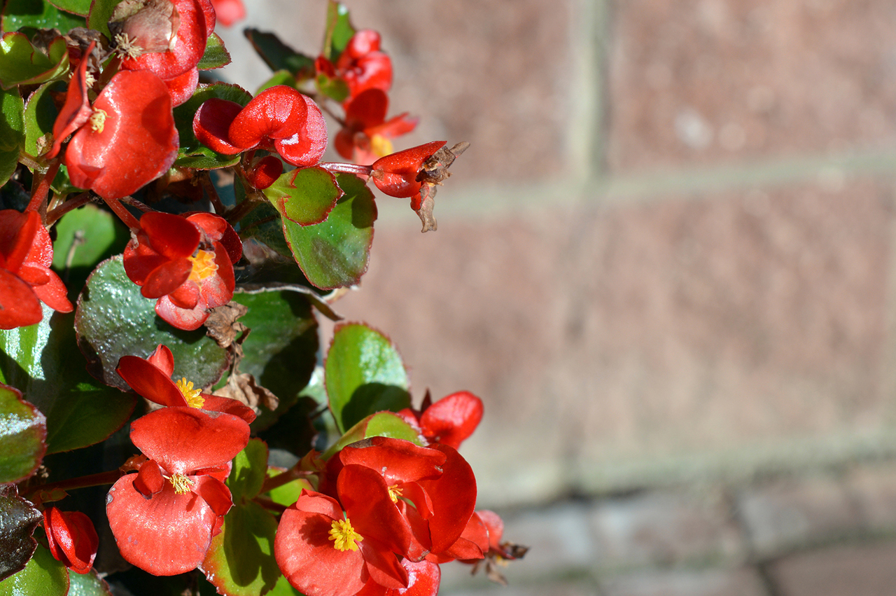 Красная вечноцветущая бегония с зелеными листьями