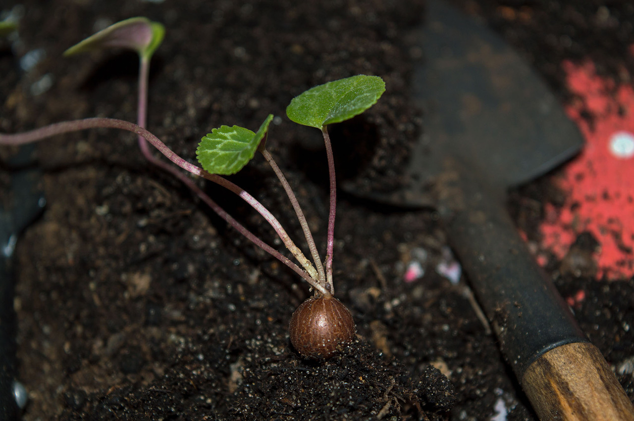 При выращивании цикламенов из семян не стоит ждать быстрых результатов. Эта фотография была сделана через 10 месяцев после посева. Всходы появились только через полгода. Иногда на прорастание требуется меньше времени — в предыдущем посеве у меня семена проросли через 1,5–2 месяца.