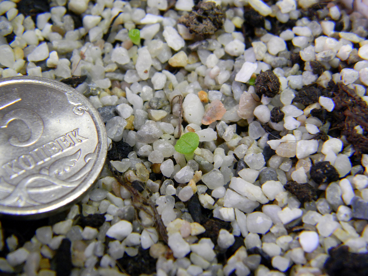 Сеянец гибридного литопса в возрасте нескольких дней