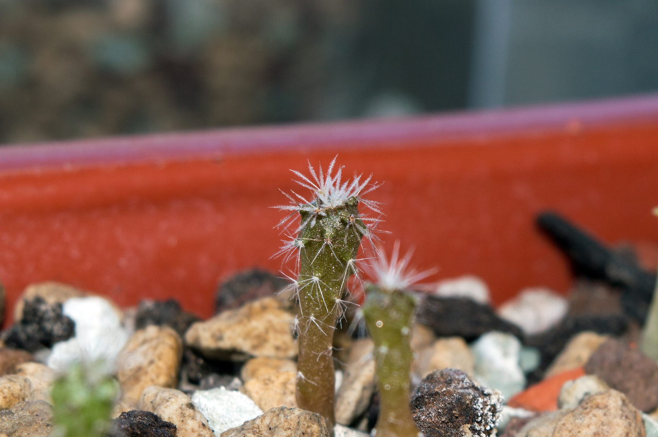 После переезда сеянцев из-под лампы на подоконник прошел месяц. Лобивии очень любят свет, при его недостатке сеянцы могут сильно вытягиваться. Однако в дальнейшем на летнем солнце стебель постепенно становится шире и оседает, растения приобретают более аккуратную форму.