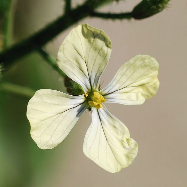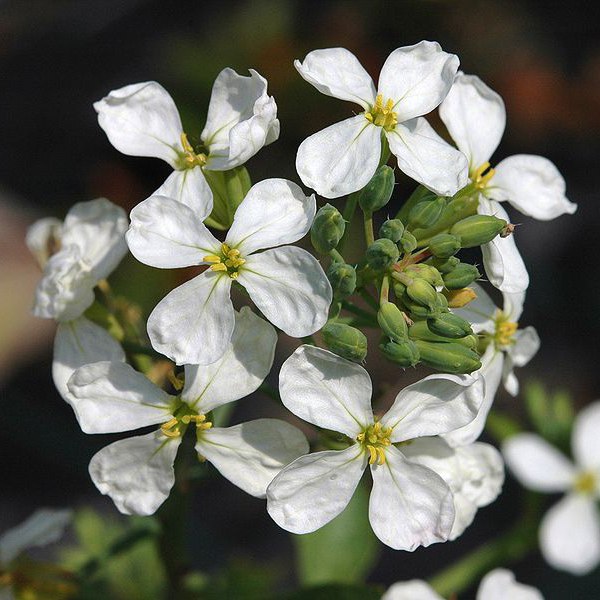 Цветки у руколы маленькие, белые или желтые с темными серединками. По вкусу более перечные, нежели листья. |