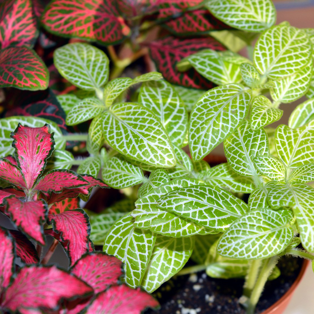 Тропическое растение-нерв, как его еще называют в народе, имеет красивые миниатюрные листья бордово- или бело-зеленой расцветки. Теплый и влажный воздух, отсутствие сквозняков — оптимальные условия для содержания фиттонии. В высоту она достигает не более 30 см.