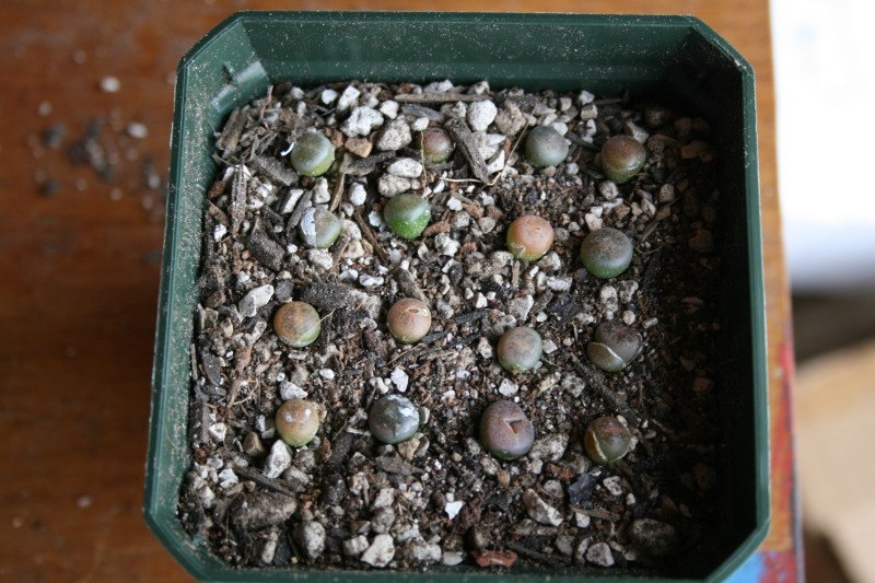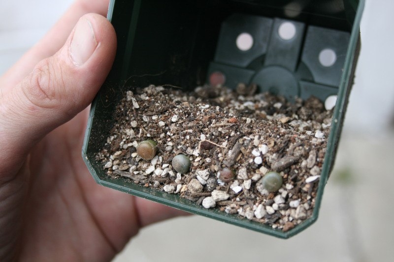 Далее наклоняем горшок, насыпаем немного субстрата и укладываем первый ряд литопсов.