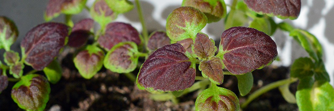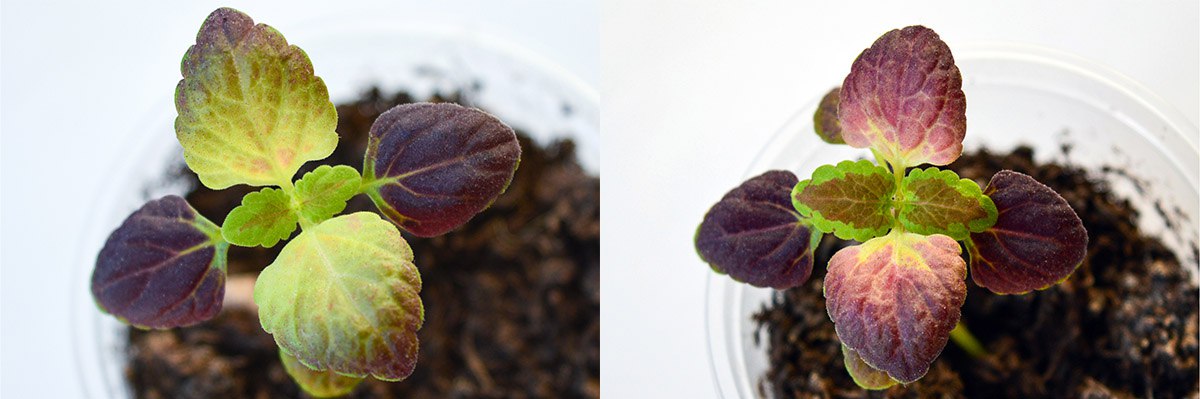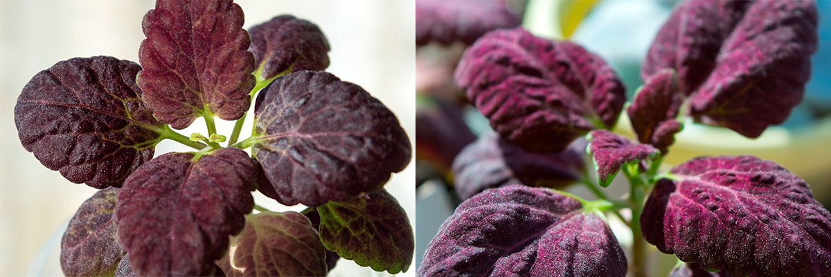 Покуда продолжительность светового дня приближалась к минимальной, окраска листьев все меньше соответствовала сорту и становилась невзрачной. Заметив это, я поняла, что еще немного — и начнут удлиняться междоузлия, а форма растений потеряет эстетику, и поставила колеусы под настольную лампу. Проблема исчезла буквально на глазах, а листва приобрела удивительно красивый цвет. В зависимости от угла и яркости освещения она переливалась от теплого темно-коричневого до глубокого бордово-фиолетового с аметистовыми искрами — именно искрами: листья сверкали на солнце!