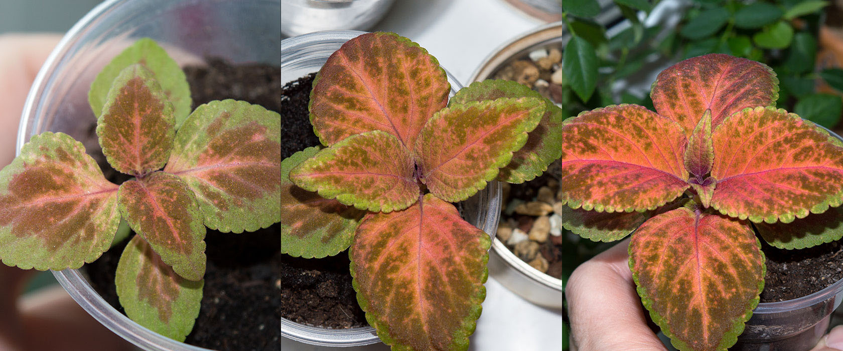 Сеяла сразу в пластиковый стакан объемом 100 мл, чтобы не заниматься лишний раз пикировкой. Никаких удобрений не вносила, лишь обеспечивала своевременный полив. Прищипка не потребовалась: в марте колеус сам начал обильно ветвиться, хотя допускаю, что это была индивидуальная особенность конкретного экземпляра.